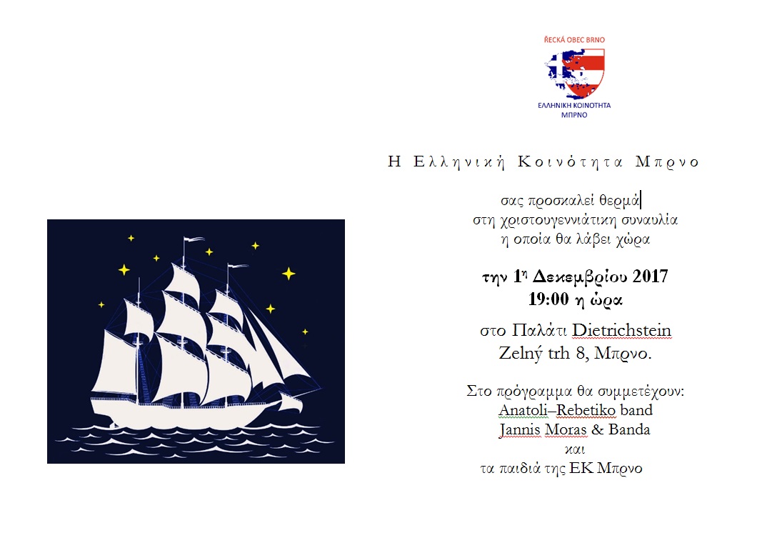 σας προσκαλούμε στην φετινή Χριστουγεννιάτικη συναυλία την οποία διοργανώνει η κοινότητά μας την Παρασκευή 1 Δεκεμβρίου 2017 19:00 η ώρα στο Παλάτι Dietrichstein Zelný trh 8, Μπρνο