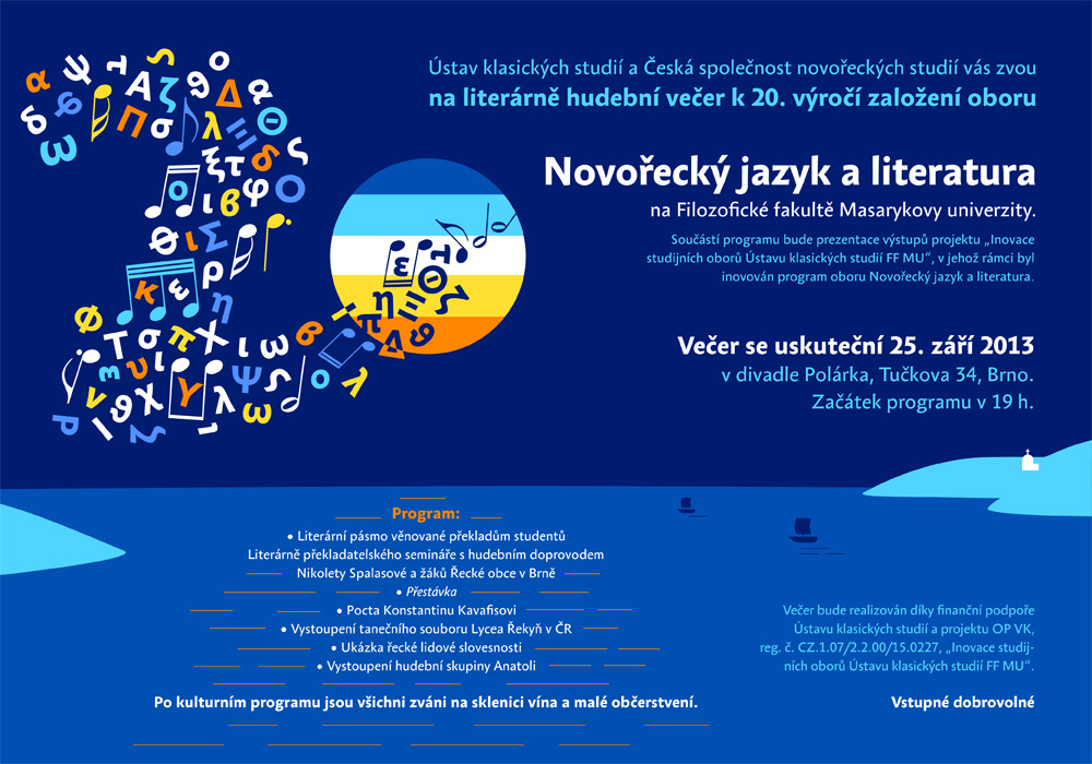 25. září 2013 se uskuteční v divadle Polárka oslava 20. výročí založení oboru Novořecký jazyk a literatura. V rámci literárně hudebního programu budou představeny překlady novořecké literatury, práce studentů novořečtiny, ale také řecký folklór a tradiční řecká hudba.